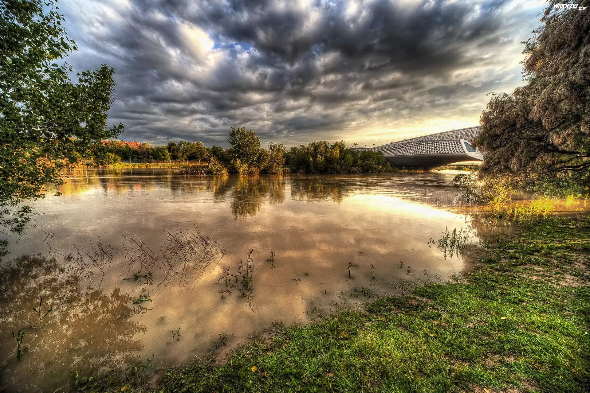 Niebo, Chmury, Rzeka, Most, HDR, Saragossa