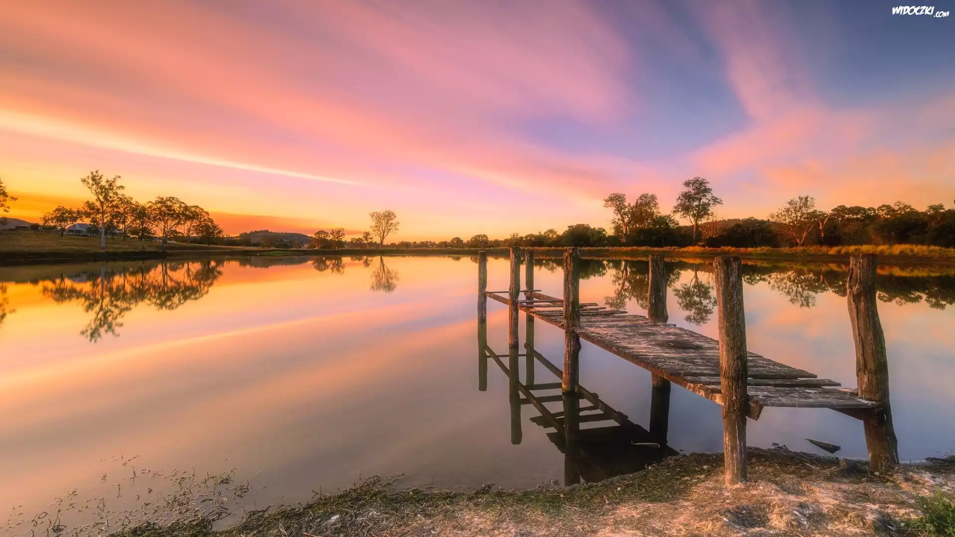 Zdjęcia, Jezioro, Pomost, Drzewa, Niebo