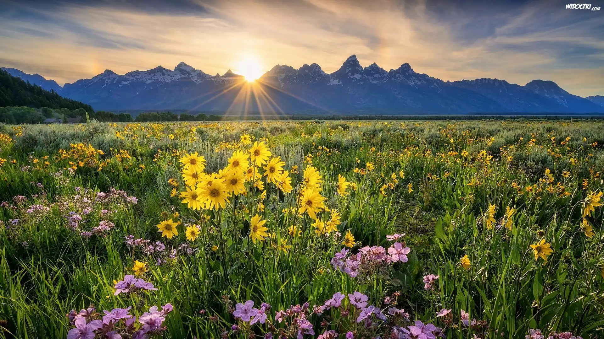 Żółte, Kwiaty, Balsamorhiza, Łąka, Góry, Promienie słońca, Niebo