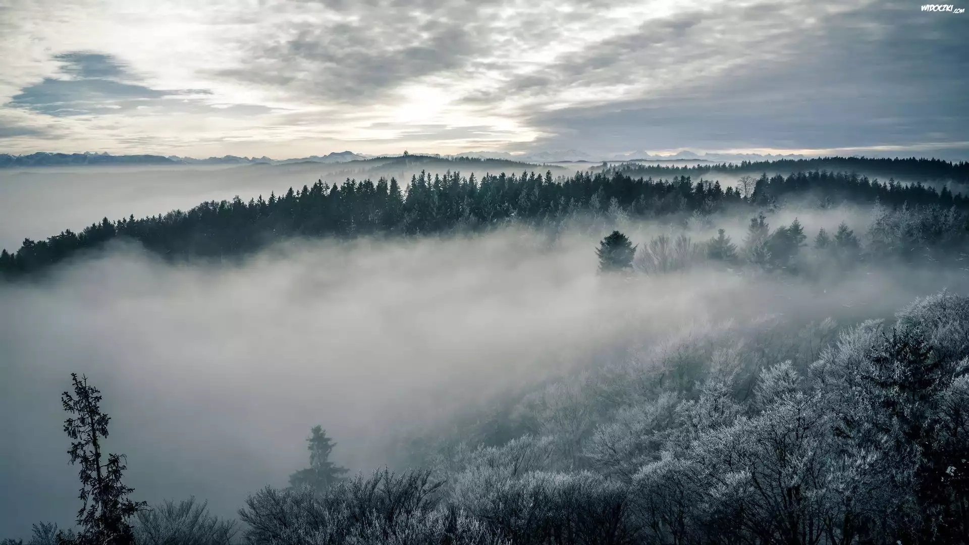 Zdjęcia, Las, Mgła, Drzewa, Niebo