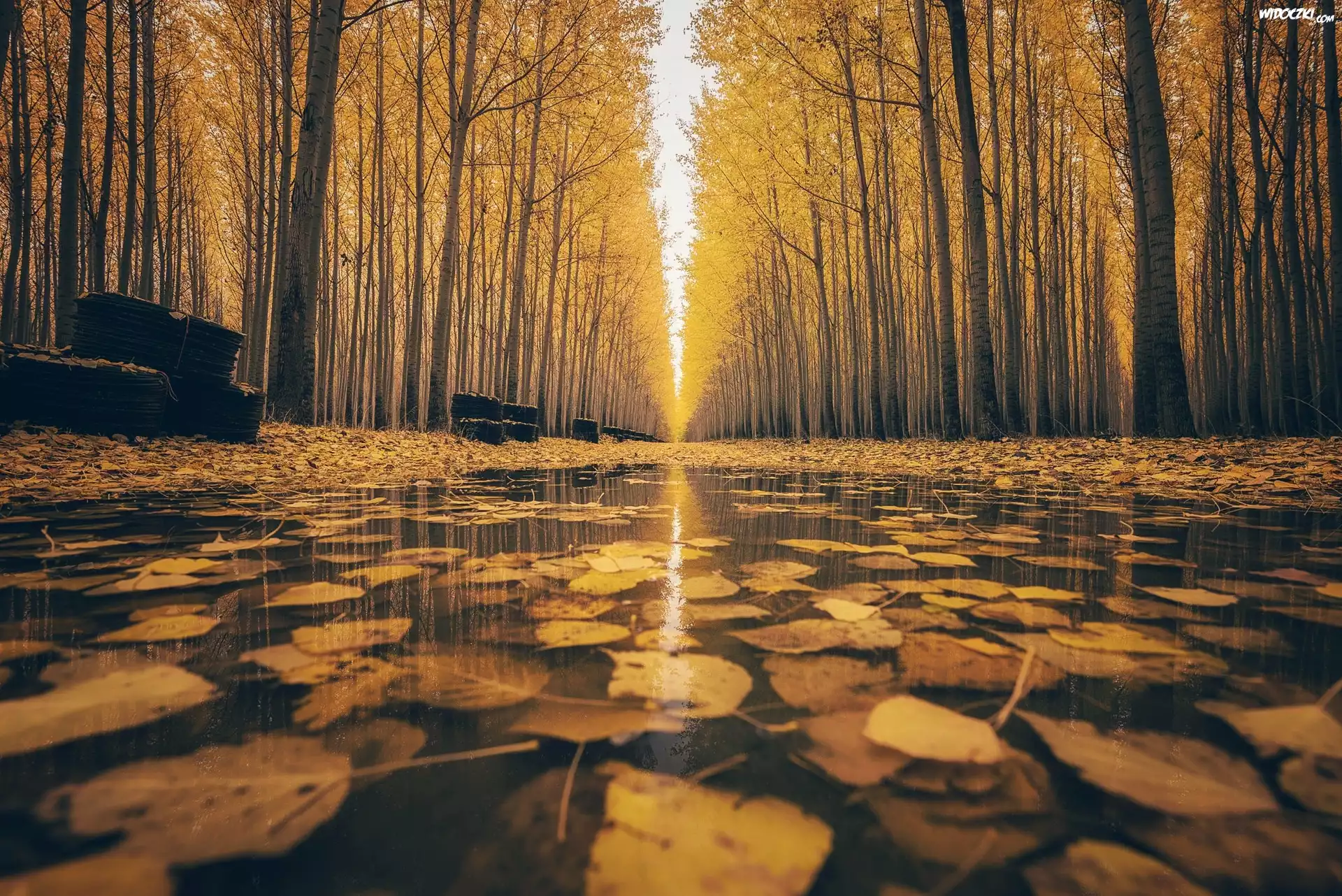 Zdjęcia, Park, Jesień, Liście, Drzewa, Topole osikowe, Kałuża, Aleja, Niebo
