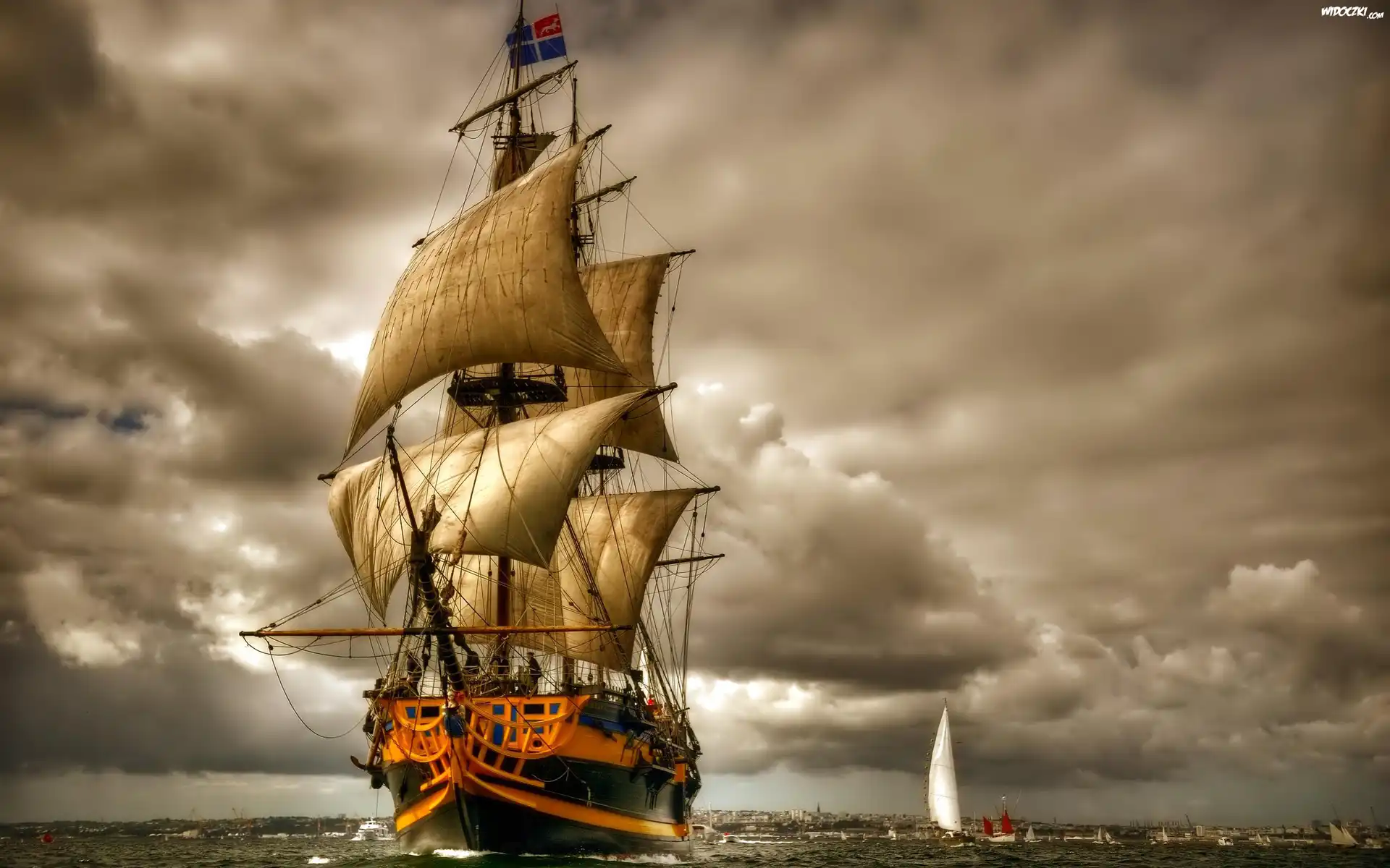 Żaglowiec, Żaglówka, Morze, Niebo, Chmury