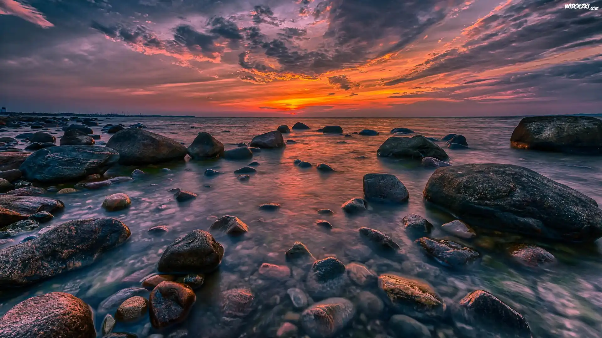 Niebo, Chmury, Zachod, Slonca, Morze, Kamienie