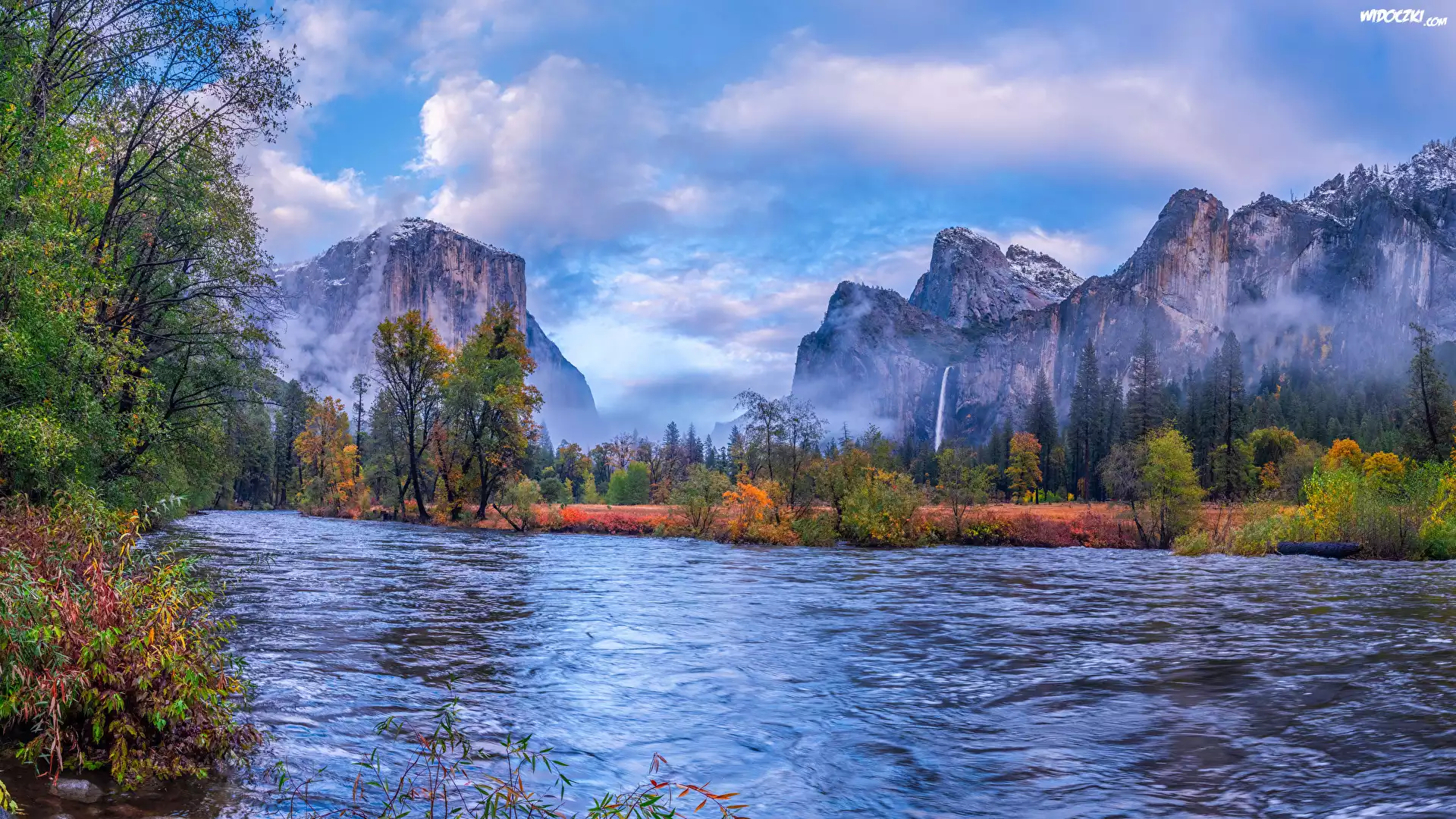Stany Zjednoczone, Kalifornia, Park Narodowy Yosemite, Granitowe, Góry, Niebo, Chmury, Rzeka, Merced River, Drzewa |