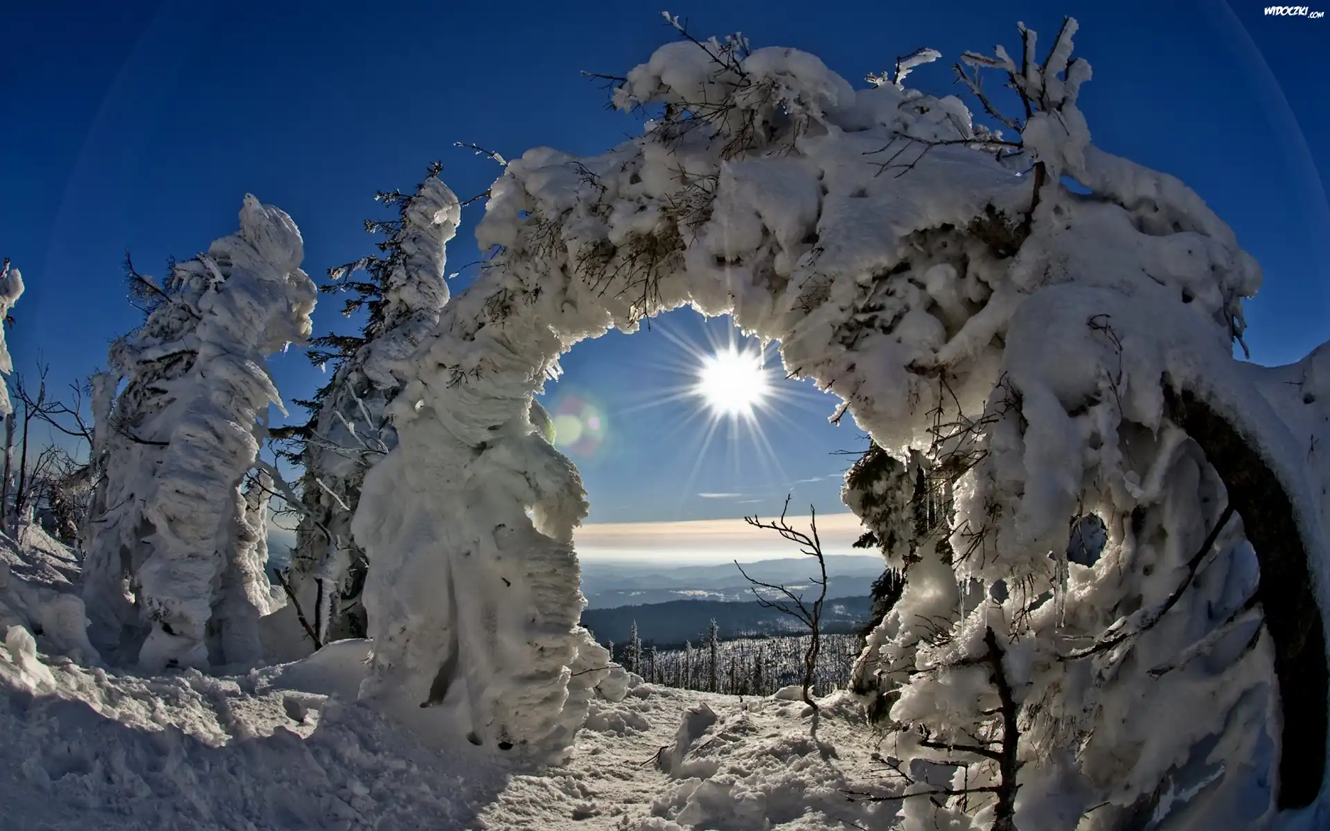 Zdjęcia, Niebo, Słońce, Ośnieżone, Drzewa