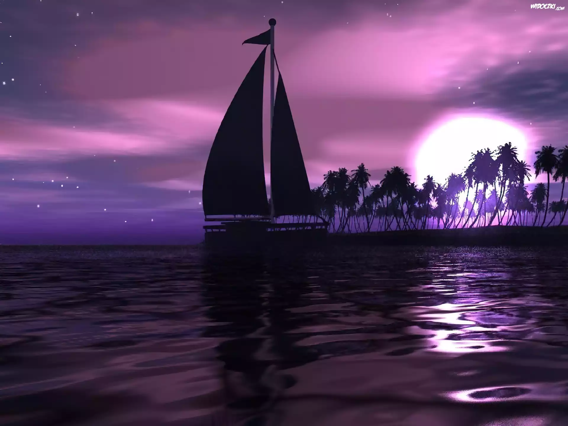 Żaglówka, Palmy, Fioletowe, Niebo, Woda