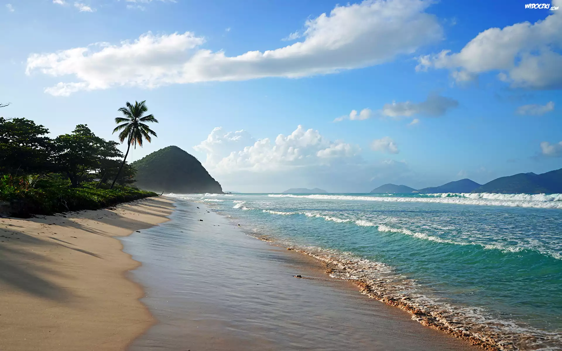 Zdjęcia, Morze, Fale, Plaża, Piasek, Drzewa, Palma, Góry, Niebo