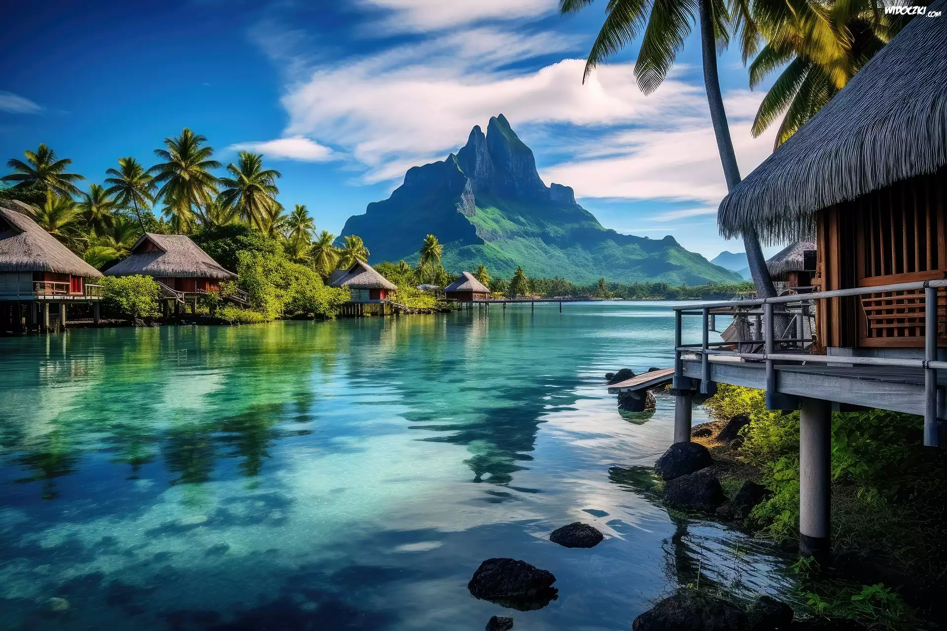 Zdjęcia, Domki, Palmy, Góra, Niebo, Grafika, Rzeka