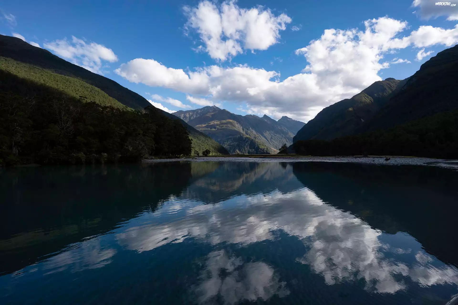 Zdjęcia, Rzeka, Odbicie, Góry, Niebo