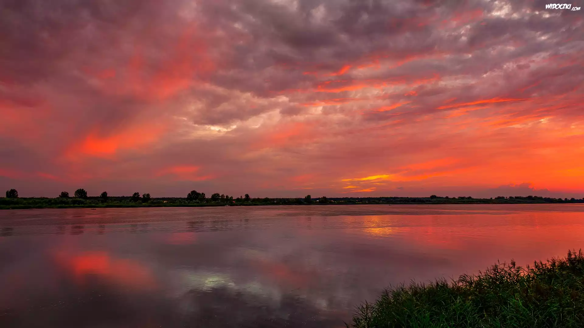 Zdjęcia, Niebo, Zachód słońca, Rzeka, Rośliny