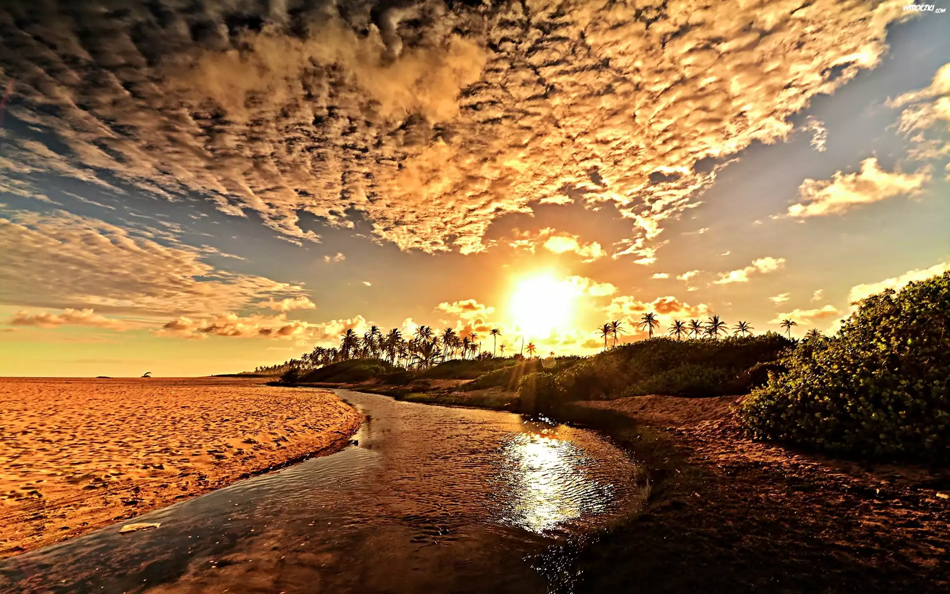 Niebo, Chmury, Świt, Pustynia, Rzeka, Palmy