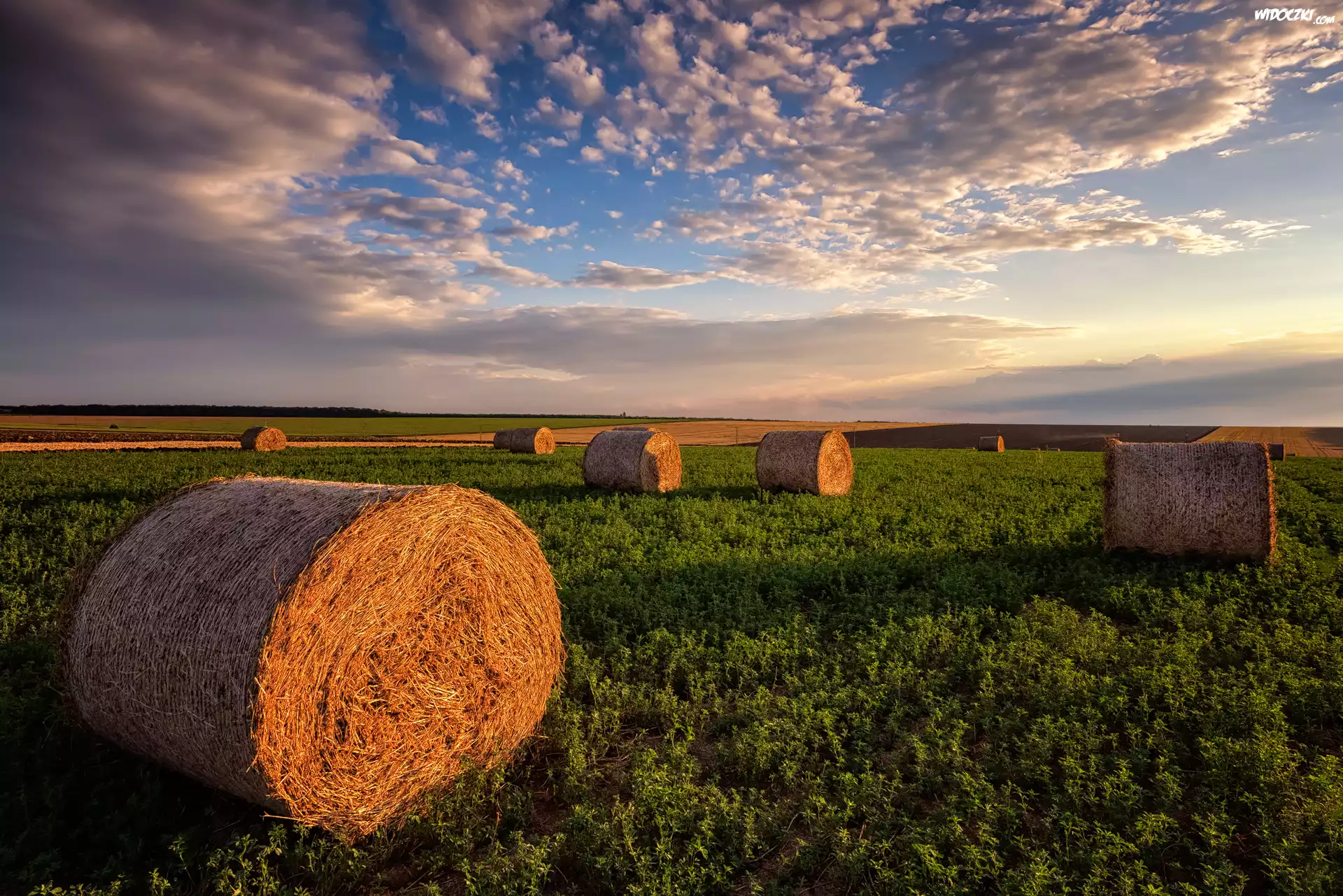 Zdjęcia, Niebo, Chmury, Trawa, Pole, Siano, Słońce