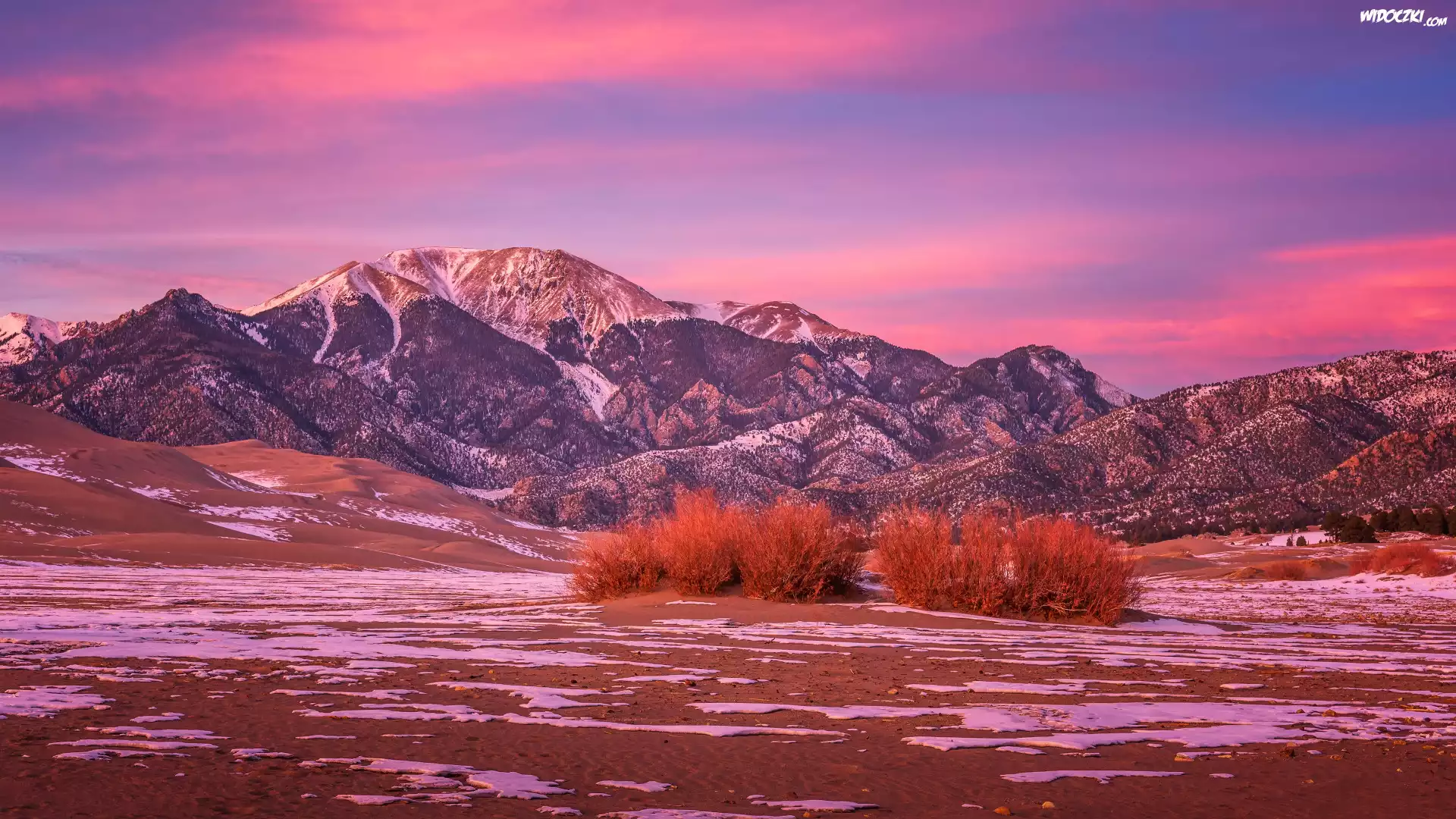 Góry, Skały, Krzewy, Niebo, Zachód słońca