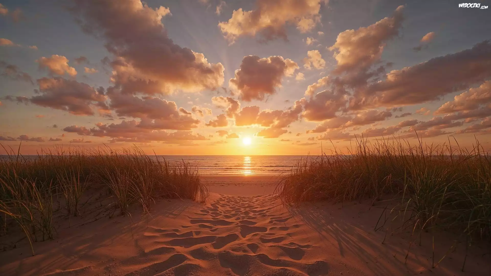 Zdjęcia, Plaża, Zachód Słońca, Niebo, Chmury, Trawa, Plaża, Niebo