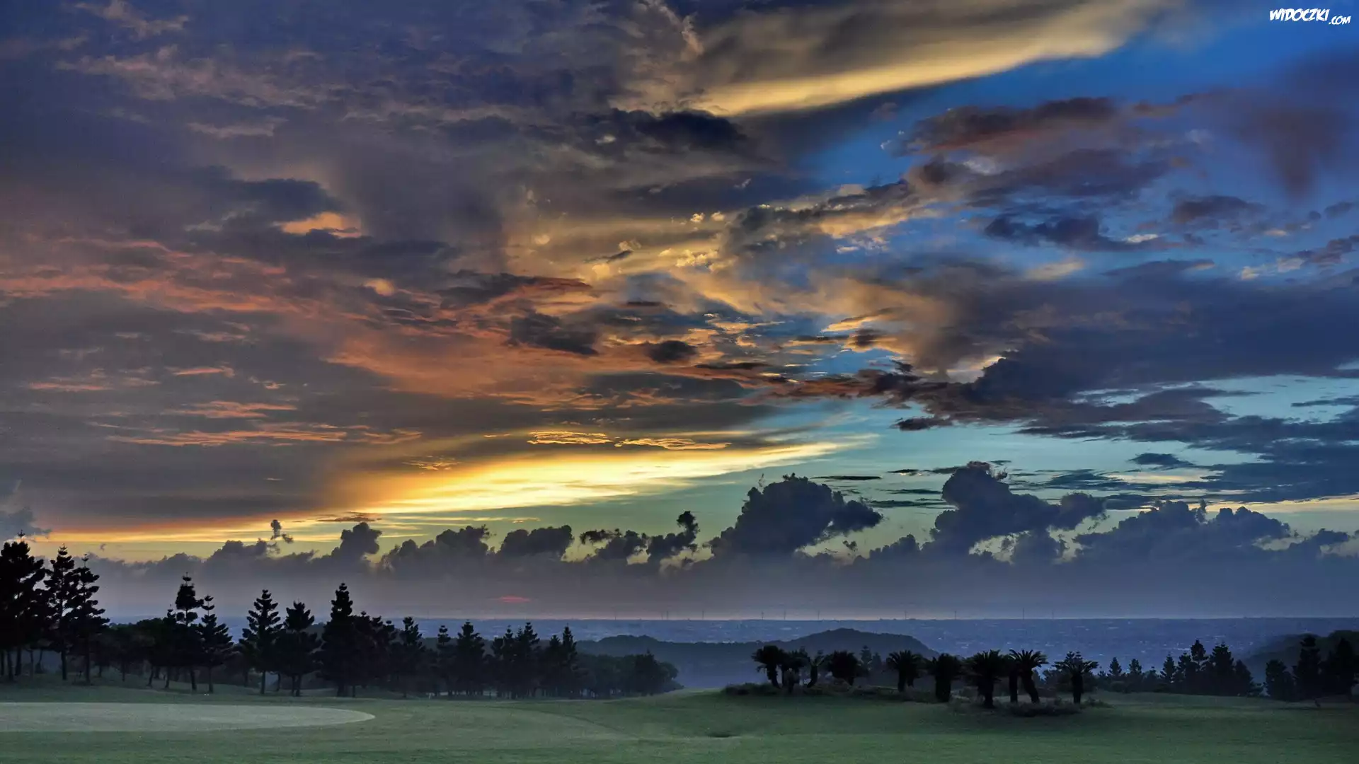 Niebo, Drzewa, Zachód, Słońca, Chmury