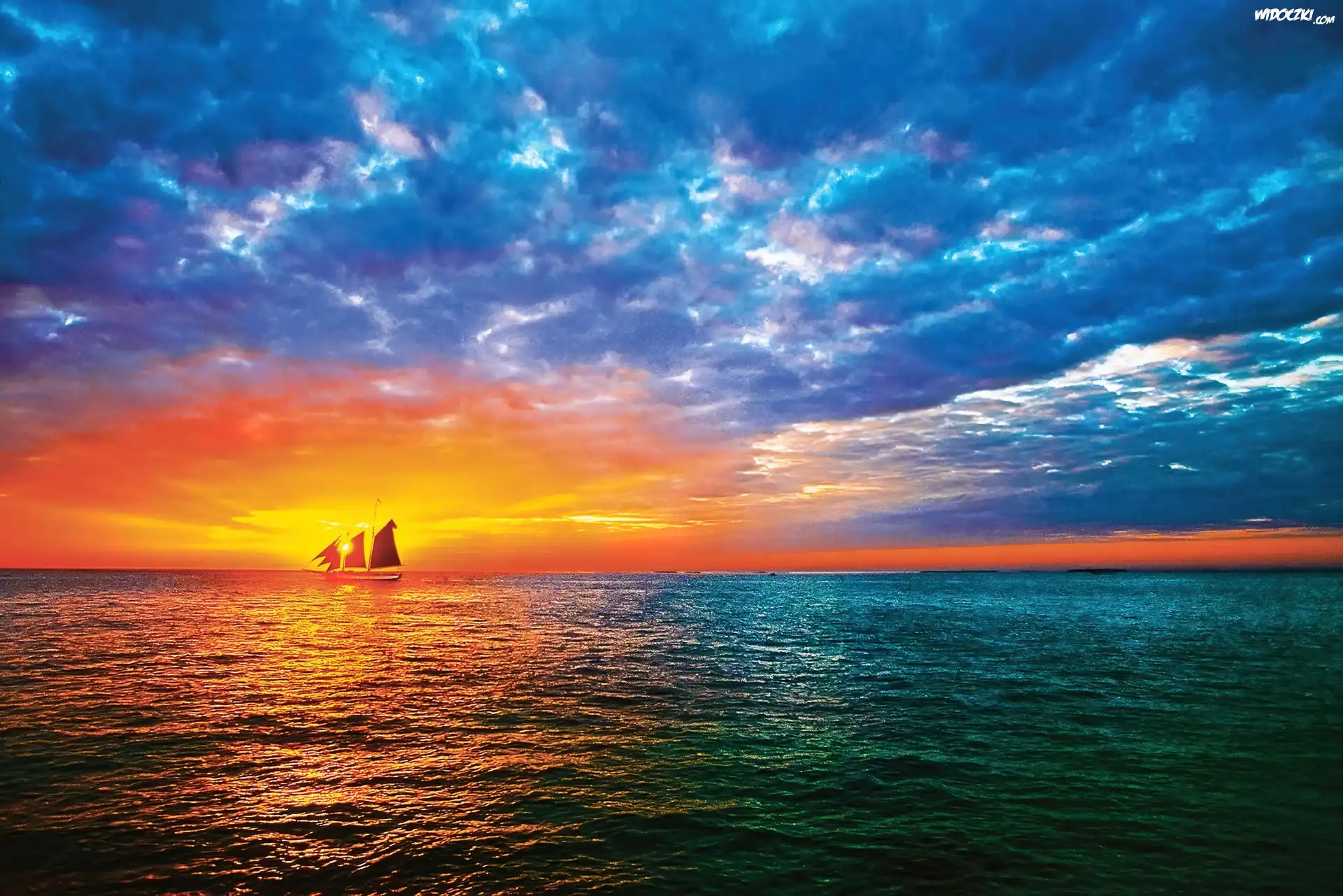 Niebo, Morze, Zachód, Słońca, Żaglówka