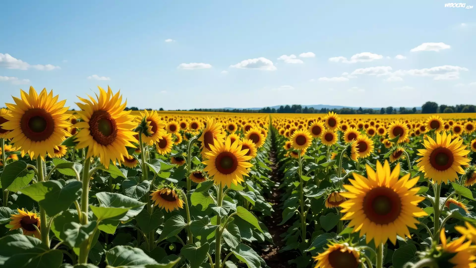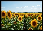 Zdjęcia, Słoneczniki, Pole, Drzewa, Niebo