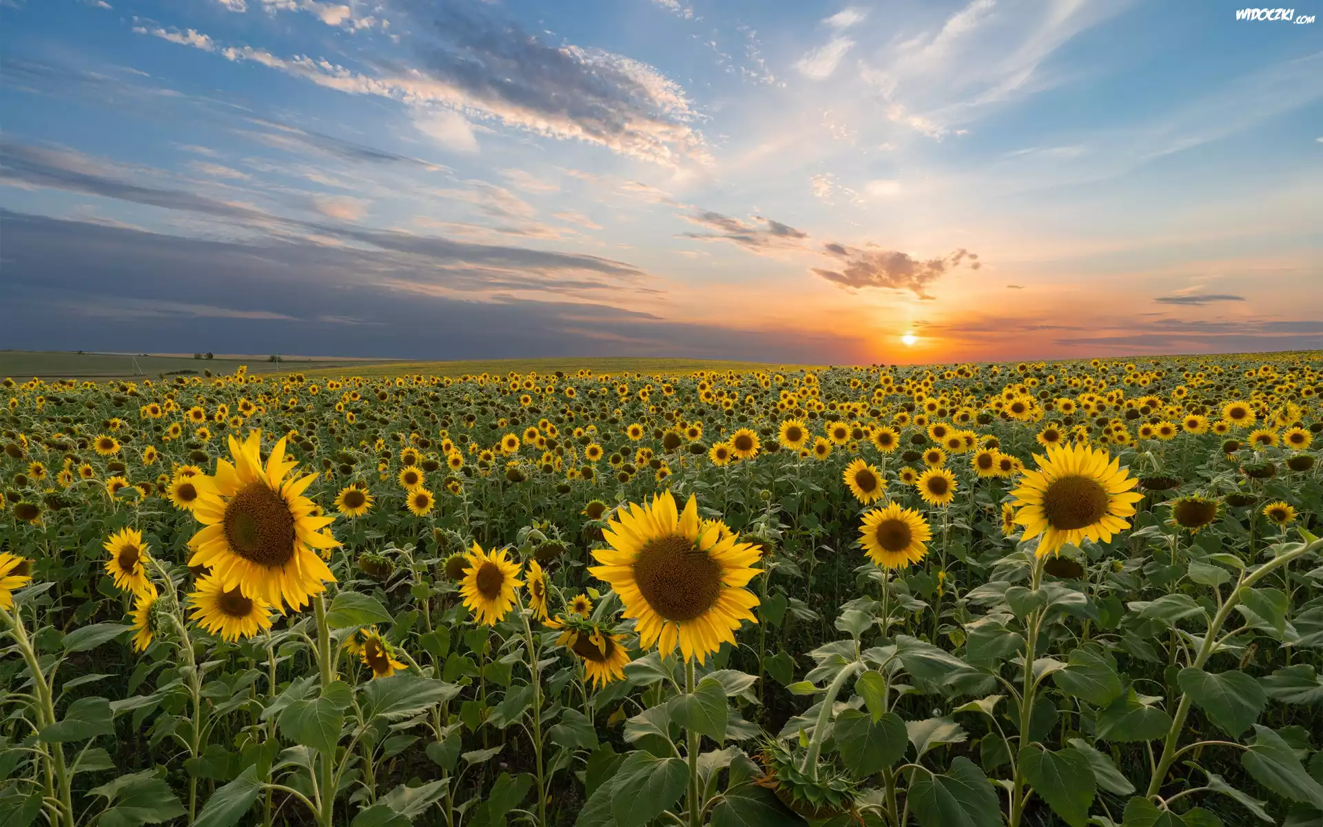 Pole, Kwiaty, Słoneczniki, Niebo, Zachód słońca, Lato
