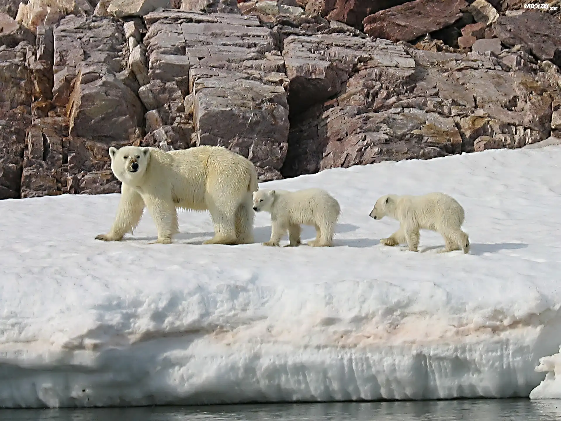 Niedzwiedź Polarny, Mama, Dzieci, Lód, Skała