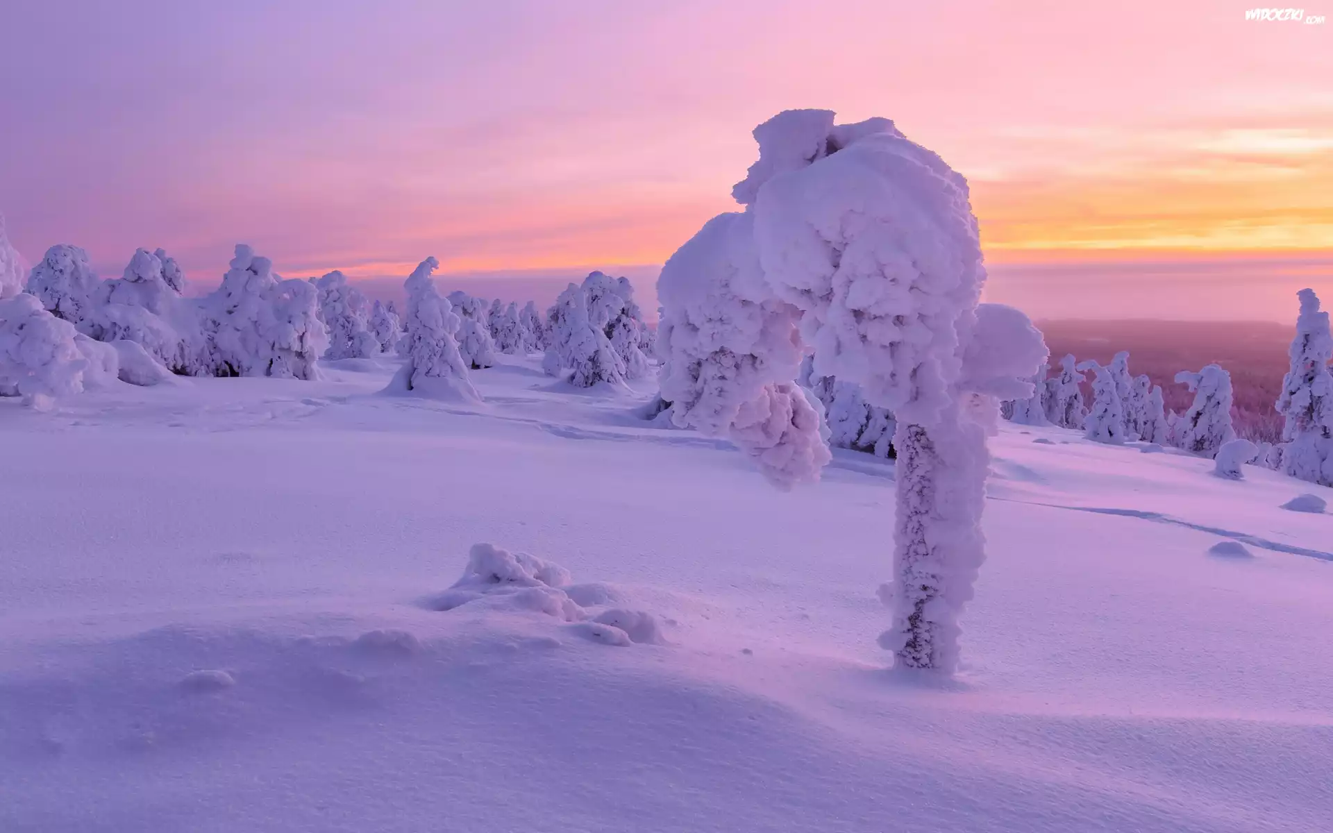 Zdjęcia, Śnieg, Zima, Ośnieżone, Drzewa, Zachód słońca
