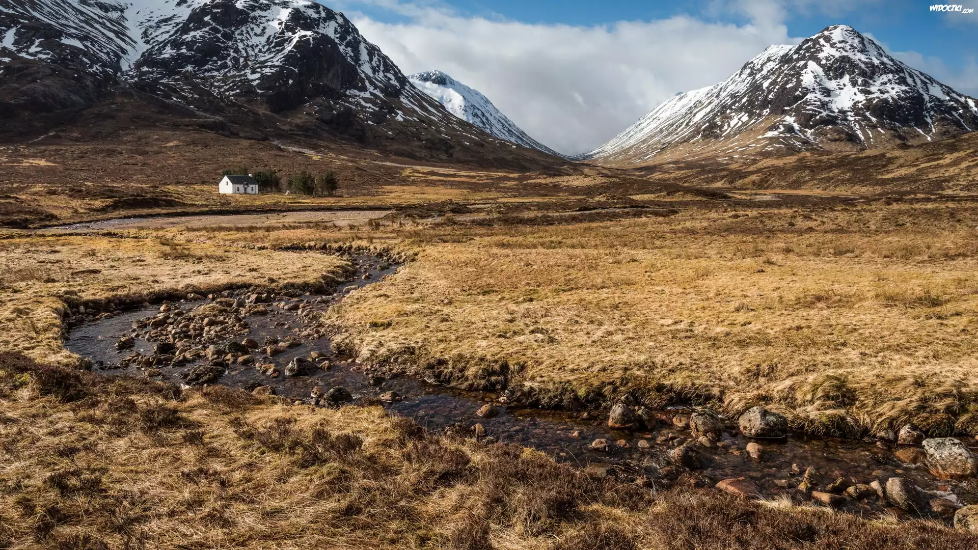 Zdjęcia, Góry, Śnieg, Łąka, Rzeka, Kamienie, Dom, Drzewa