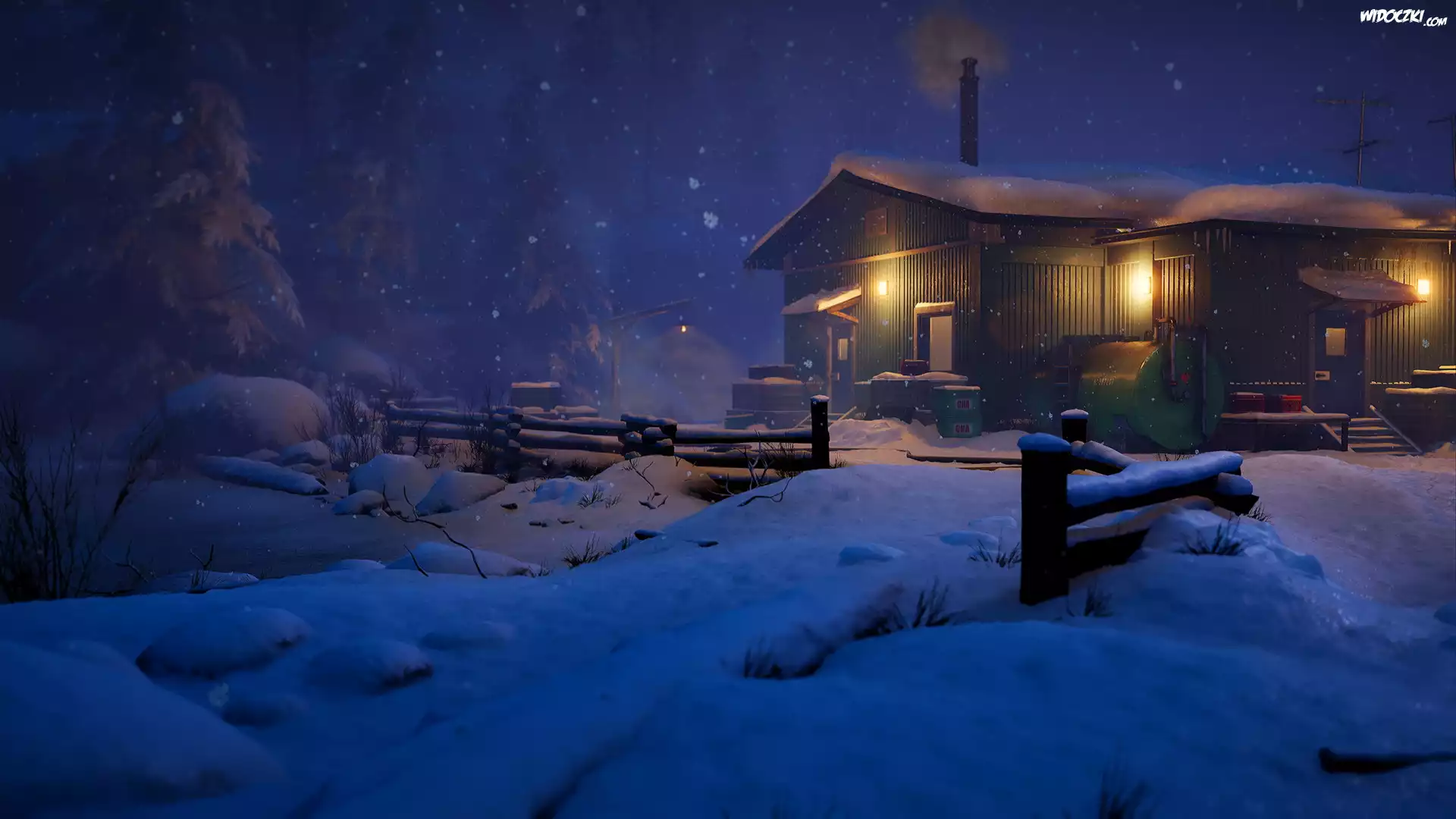 Zdjęcia, Zima, Śnieg, Noc, Dom, Światła, Ogrodzenie, Drzewa, Grafika