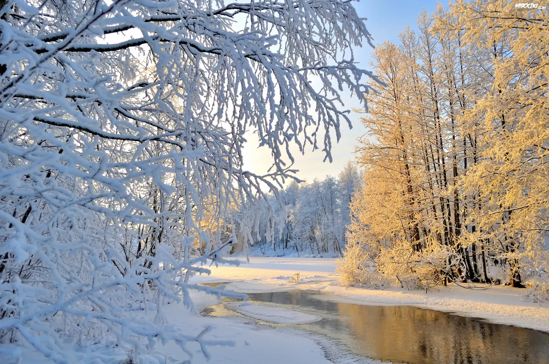 Finlandia, Karelia Północna, Gmina Liperi, Zima, Drzewa, Las, Rzeka, Śnieg