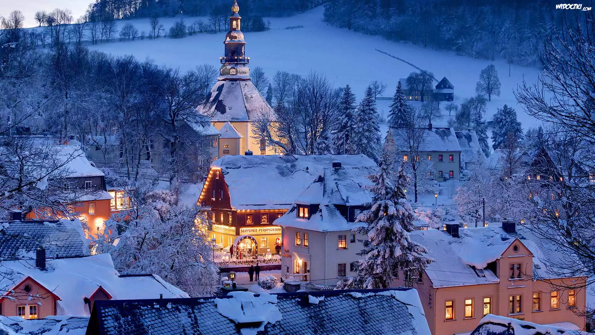 Niemcy, Saksonia, Seiffen Erzgeb, Domy, Kościól, Oświetlenie, Zima, Śnieg