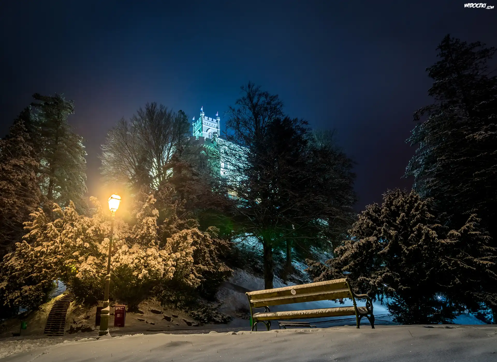 Zdjęcia, Zamek Trakoscan, Chorwacja, Zima, Noc, Park, Drzewa, Ławka, Latarnia