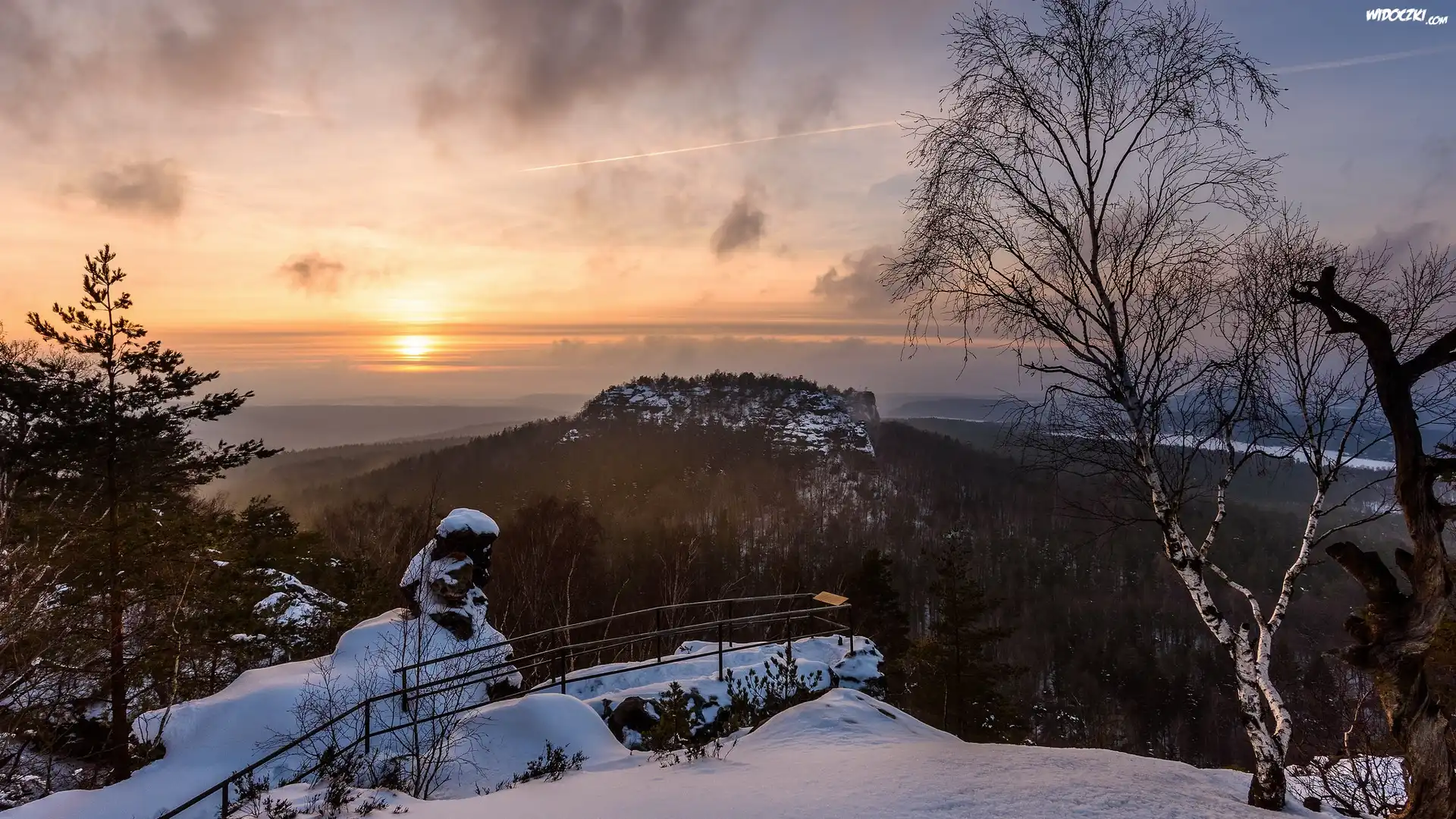 Zima, Śnieg, Góry, Zachód słońca, Drzewa, Brzoza