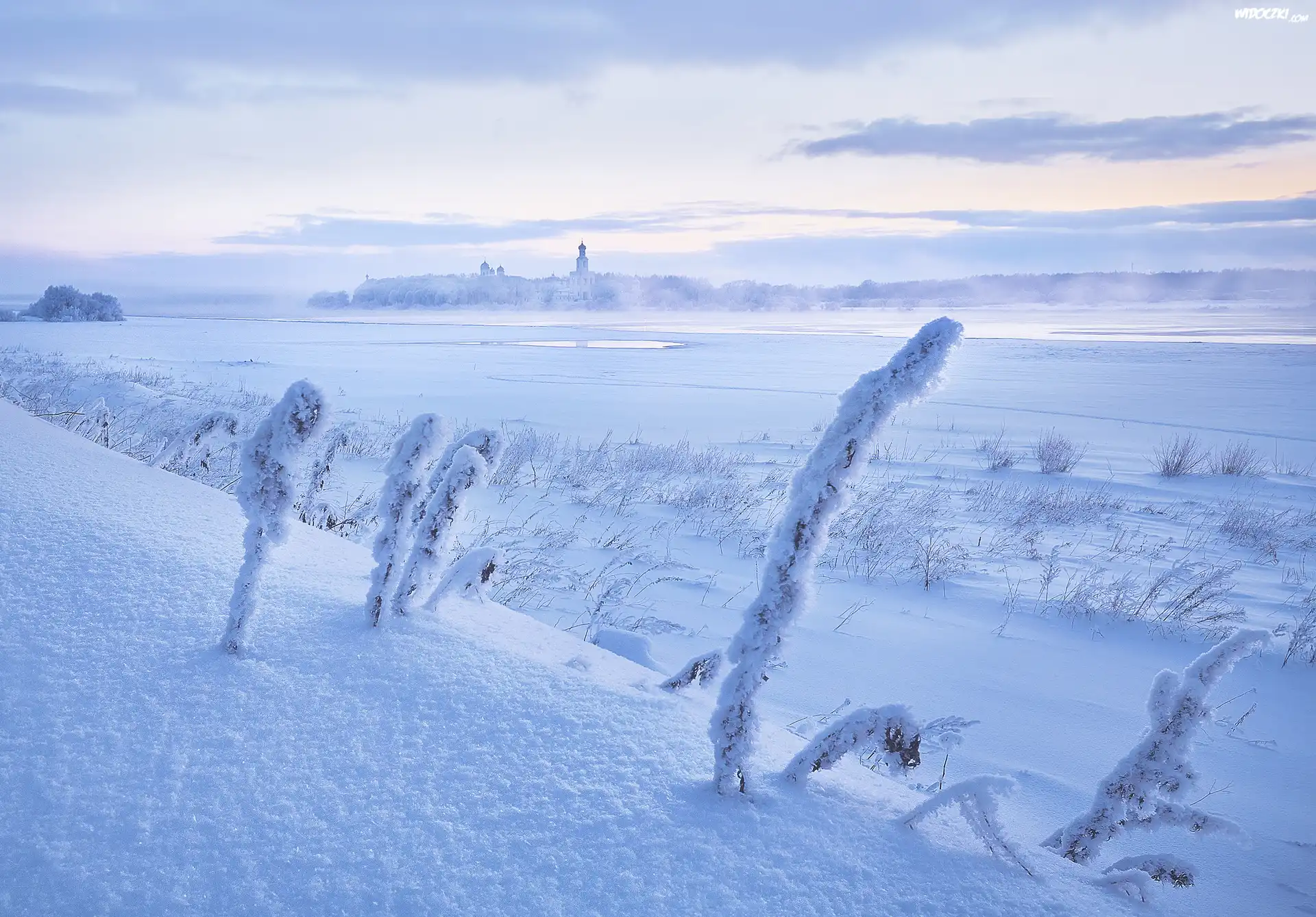 Zdjęcia, Zima, Śnieg, Trawa, Rośliny, Zaśnieżona, Rzeka, Cerkiew