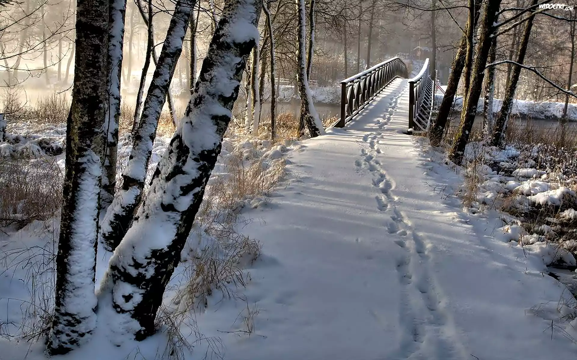 Zdjęcia, Zima, Śnieg, Park, Drzewa, Drewniany, Most, Ślady