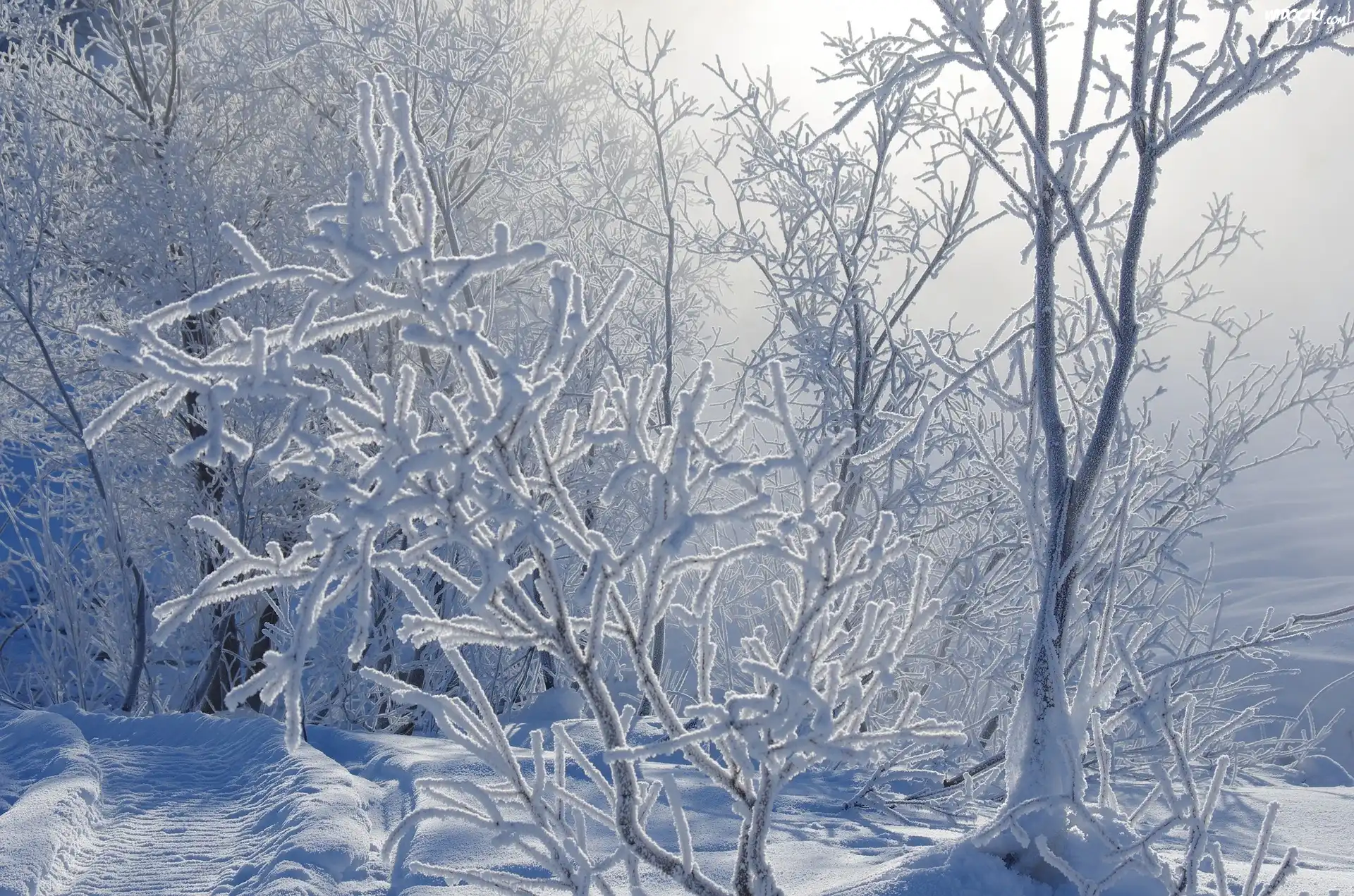 Zdjęcia, Zima, Śnieg, Drzewa, Krzewy, Ośnieżone, Gałęzie, Mgła