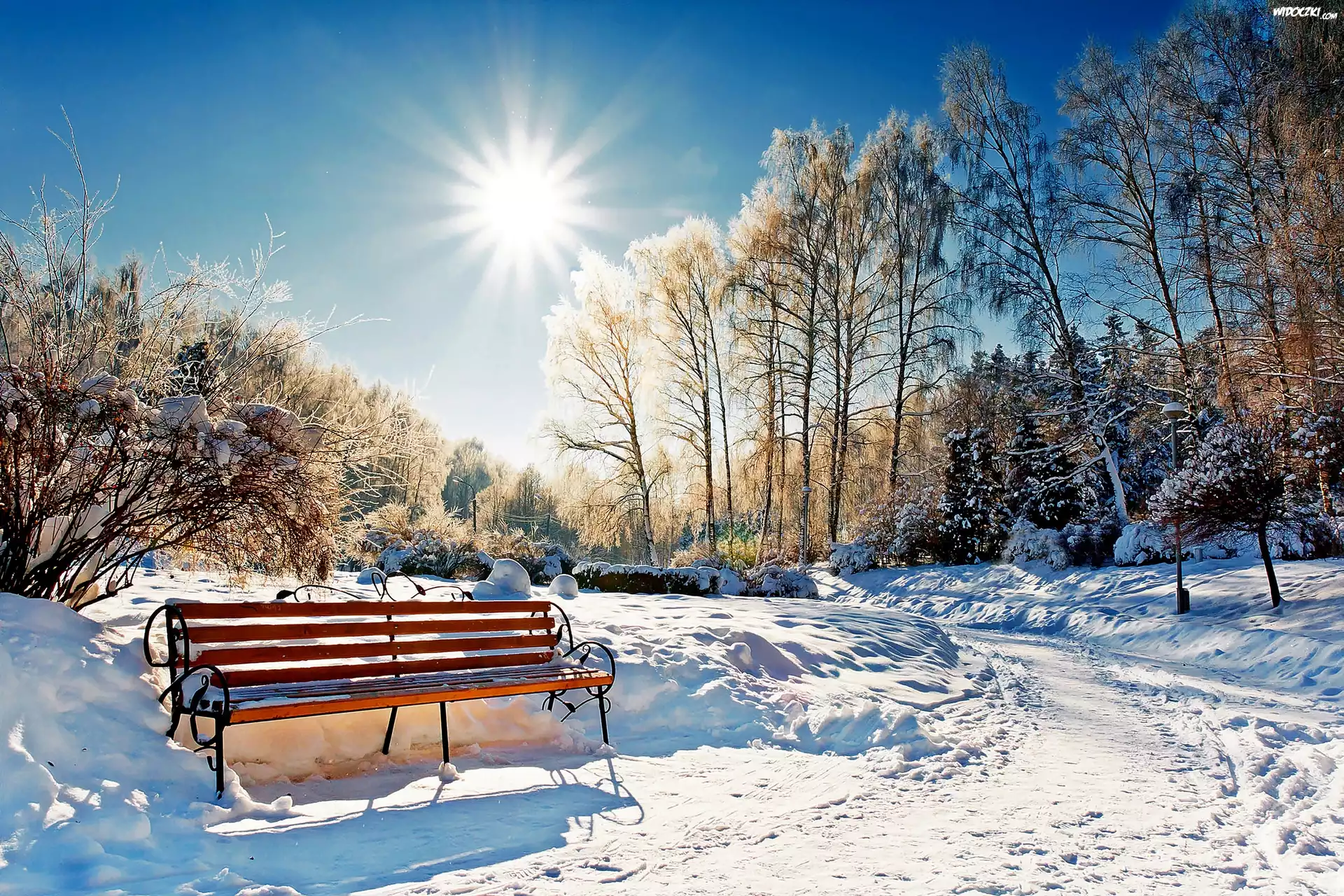 Zima, Śnieg, Drzewa, Ławka, Promienie Słońca, Park