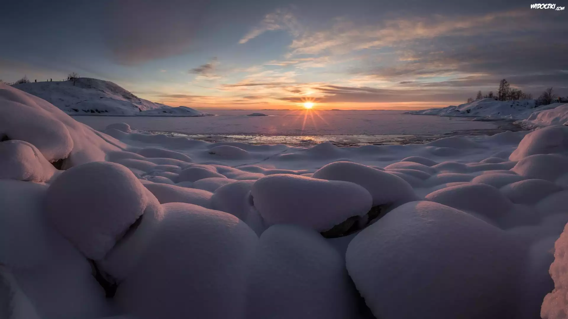 Zdjęcia, Zima, Śnieg, Lód, Jezioro, Kamienie, Zachód słońca