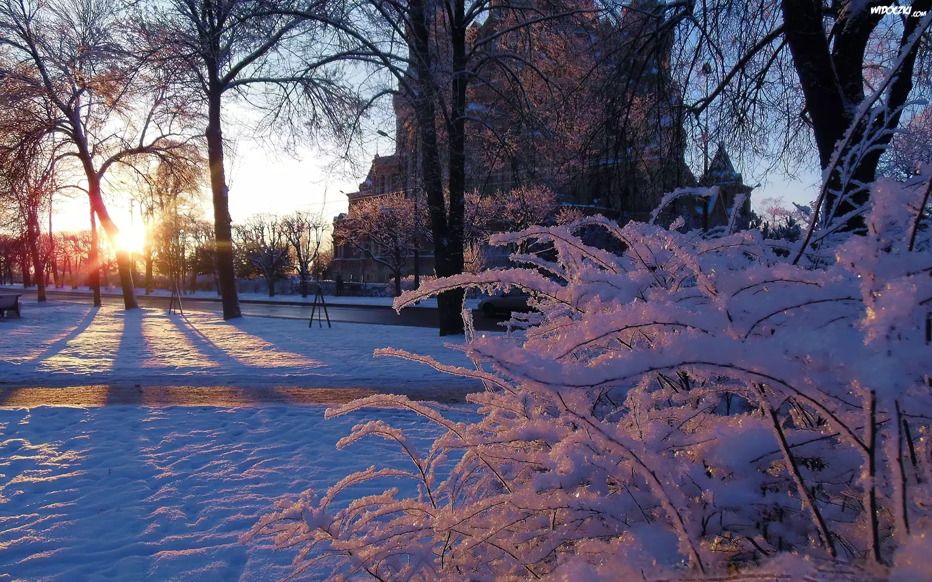 Zdjęcia, Zima, Śnieg, Dom, Drzewa, Krzewy, Promienie, Słońca