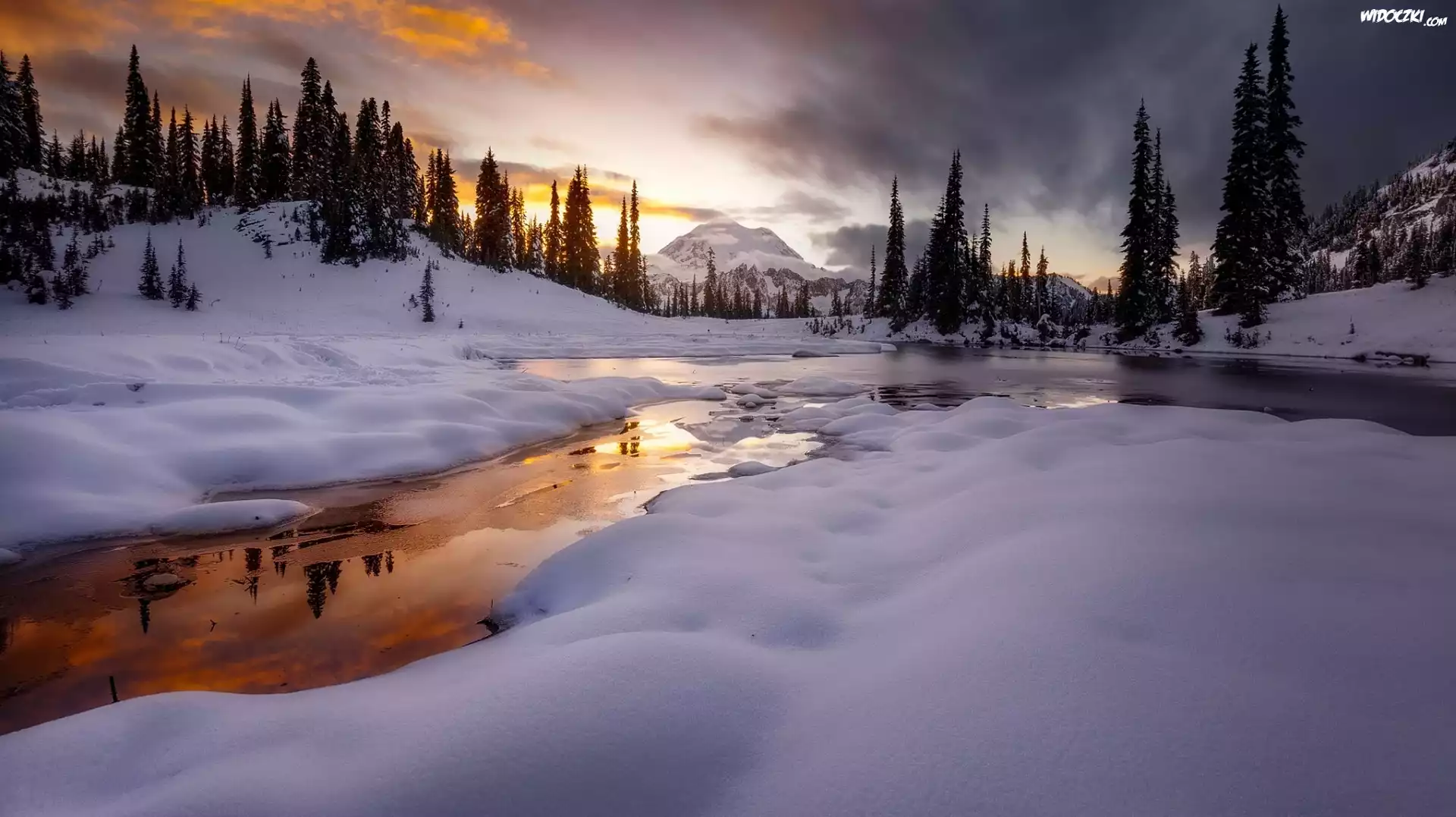 Zima, Śnieg, Jezioro Tipsoo Lake, Góry, Stratowulkan Mount Rainier, Drzewa, Zachód słońca, Park Narodowy Mount Rainier, Stan Waszyngton, Stany Zjednoczone |