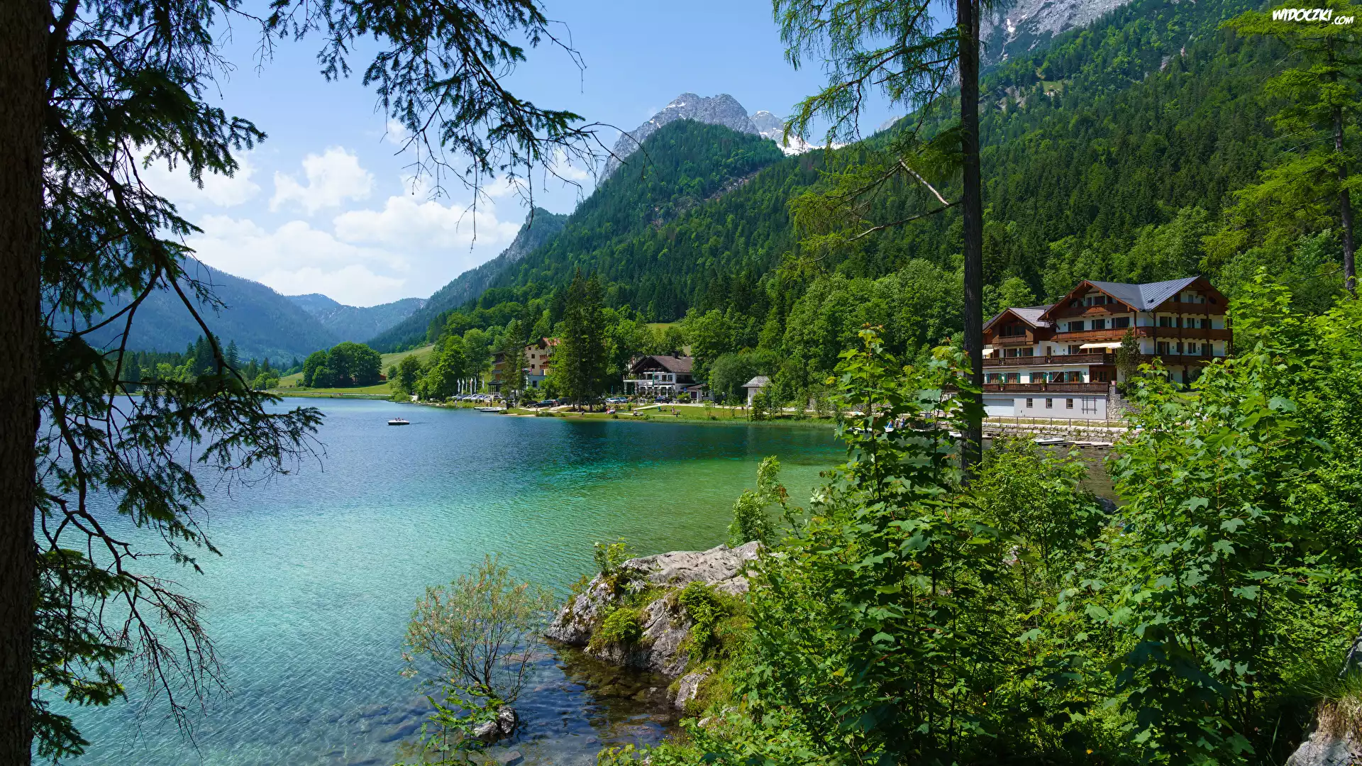 Zdjęcia, Jezioro Hintersee, Góry Alpy, Drzewa, Domy, Gmina Berchtesgadener, Bawaria, Niemcy