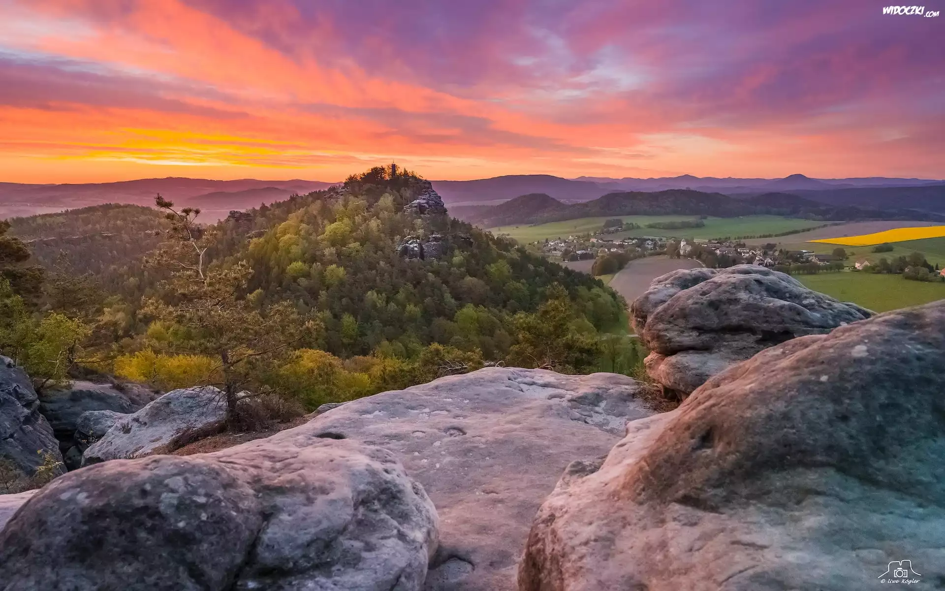 Zdjęcia, Niemcy, Saksonia, Góry, Góra Gohrisch, Skały, Drzewa, Wschód słońca