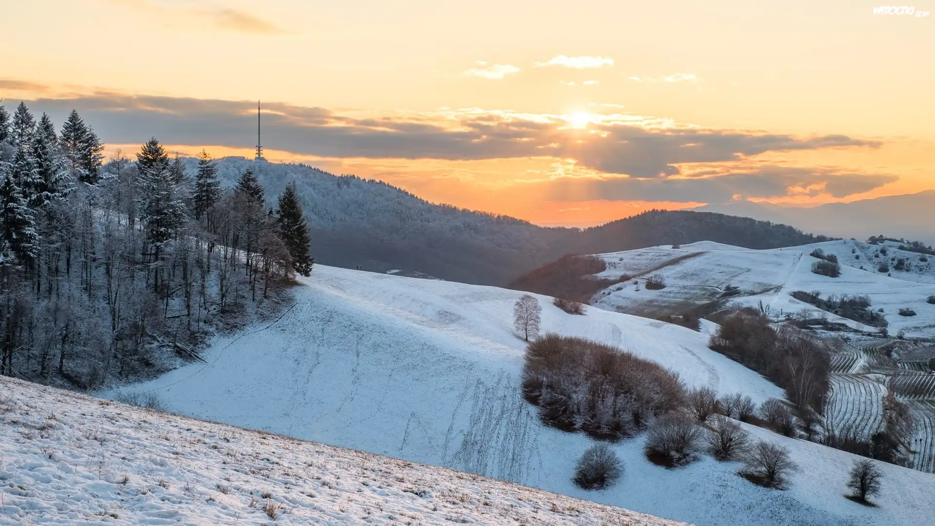 Zdjęcia, Zima, Góry, Wzgórza, Kaiserstuhl, Drzewa, Wschód słońca, Badenia-Wirtembergia, Niemcy