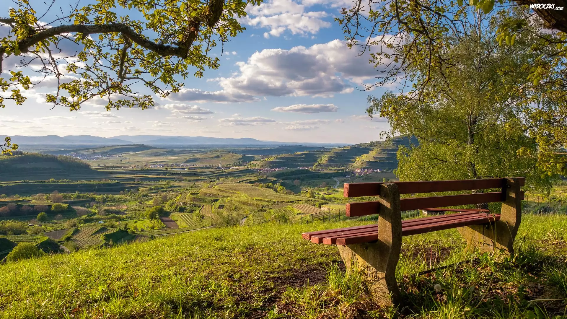 Zdjęcia, Łąka, Drzewo, Ławka, Pola, Winnice, Kaiserstuhl, Vogtsburg, Niemcy