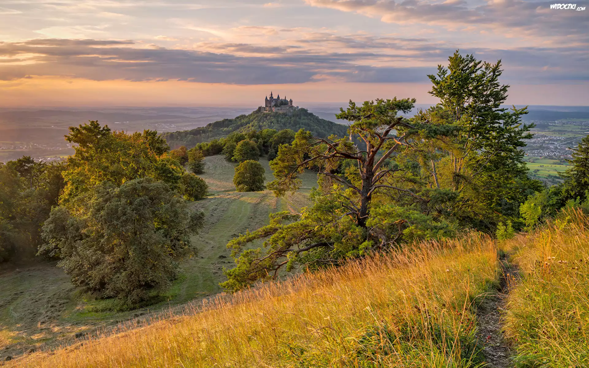 Góry, Góra Hohenzollern, Zamek Hohenzollern, Drzewa, Trawa, Niemcy