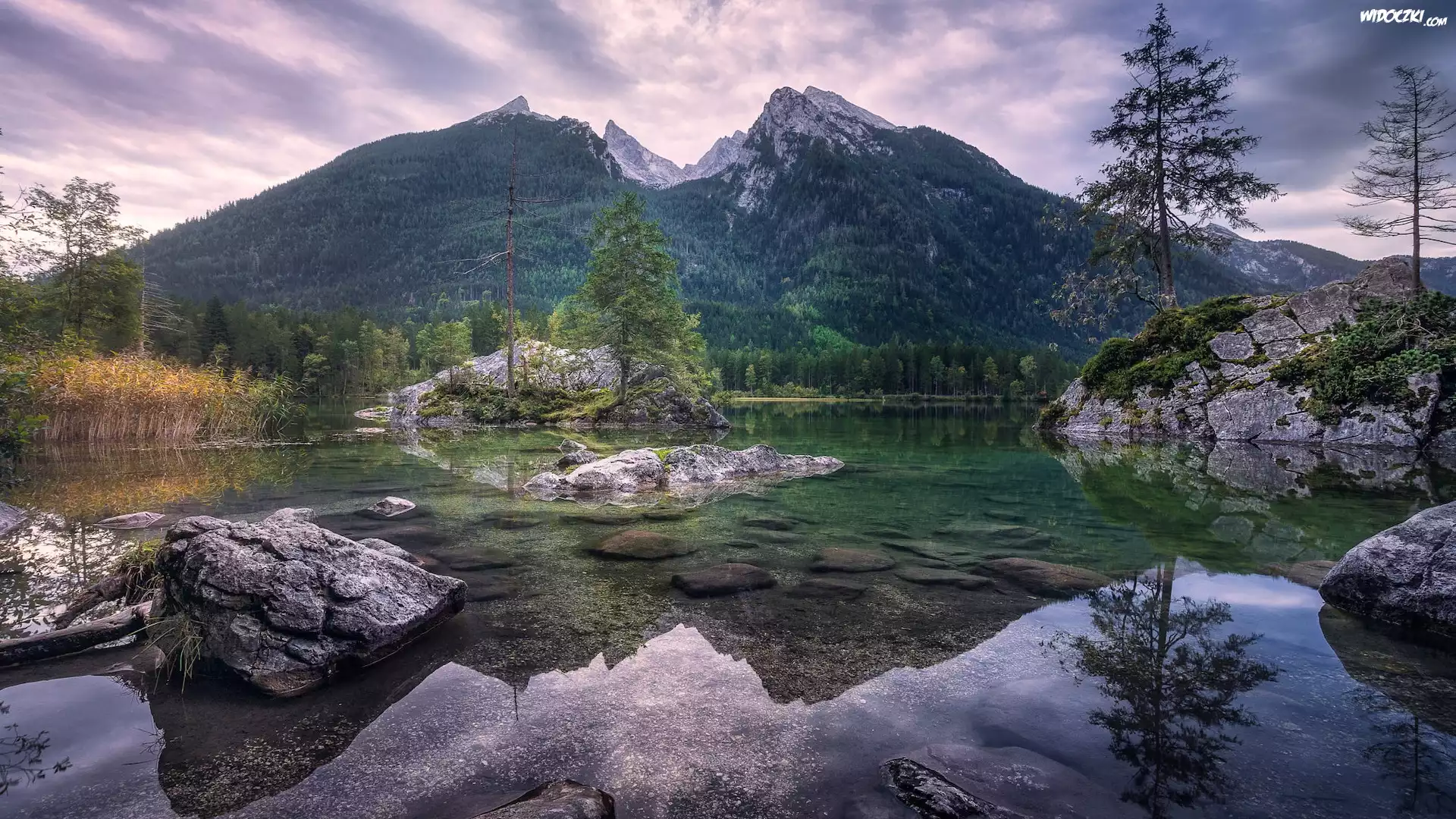 Zdjęcia, Niemcy, Bawaria, Góry, Alpy, Jezioro Hintersee, Skały, Drzewa, Las, Odbicie