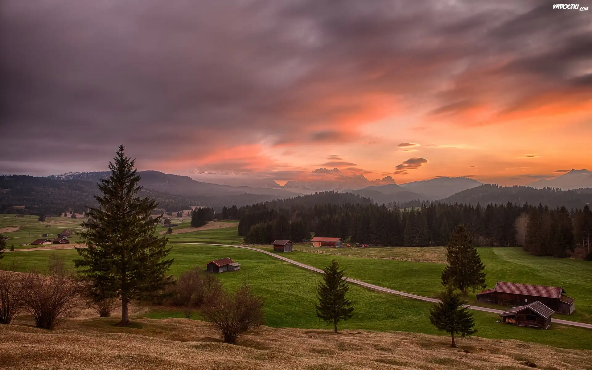 Karwendel, Alpy, Lasy, Drogi, Domy, Zachód, Słońca, Bawaria, Niemcy