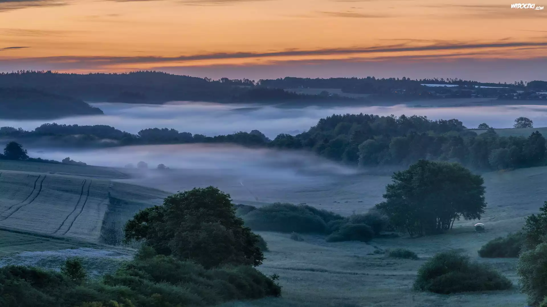 Pola, Drzewa, Mgła, Wschód słońca, Nadrenia-Palatynat, Niemcy