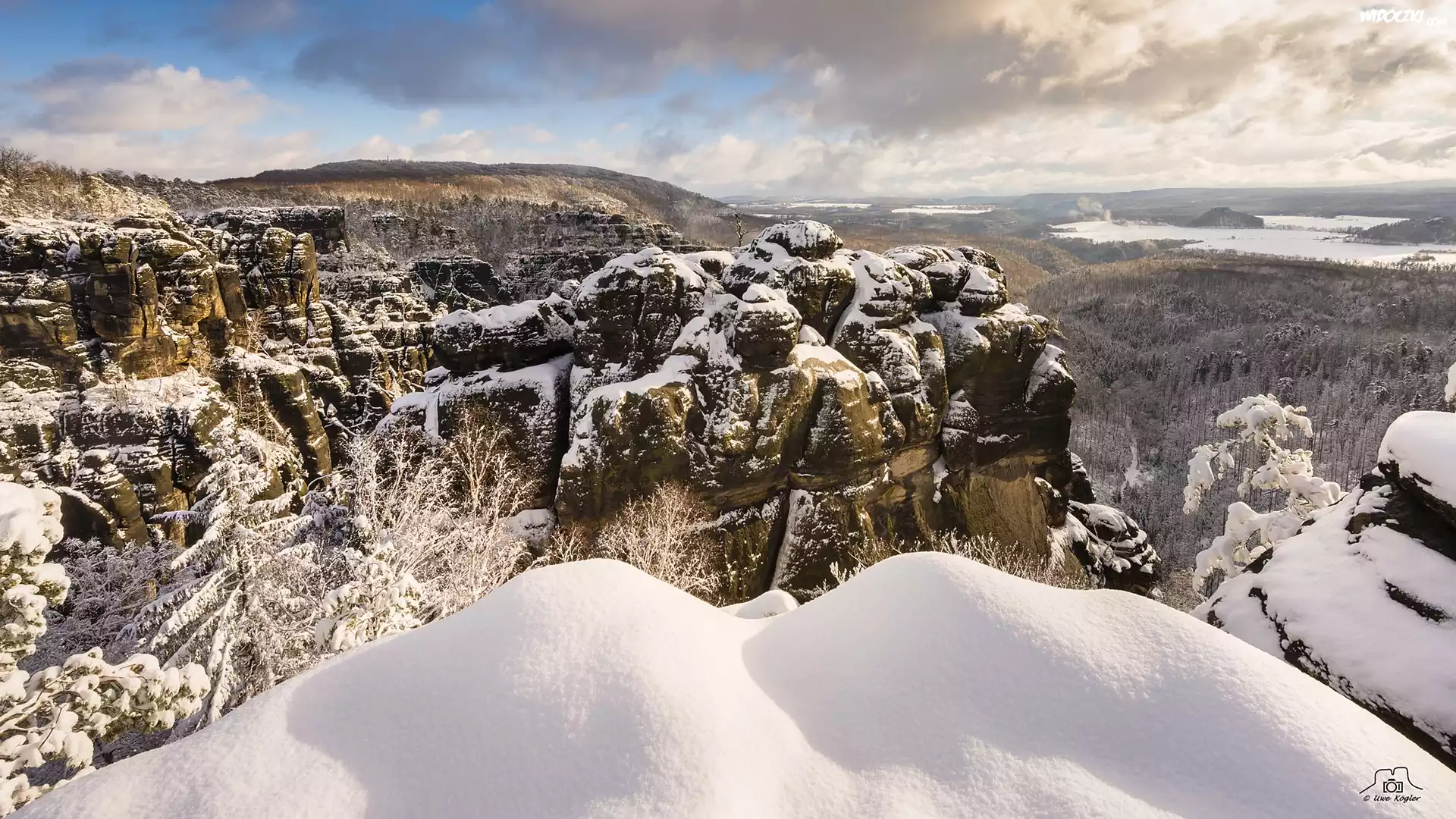 Zdjęcia, Niemcy, Góry Połabskie, Saska Szwajcaria, Skały, Śnieg, Zima, Drzewa