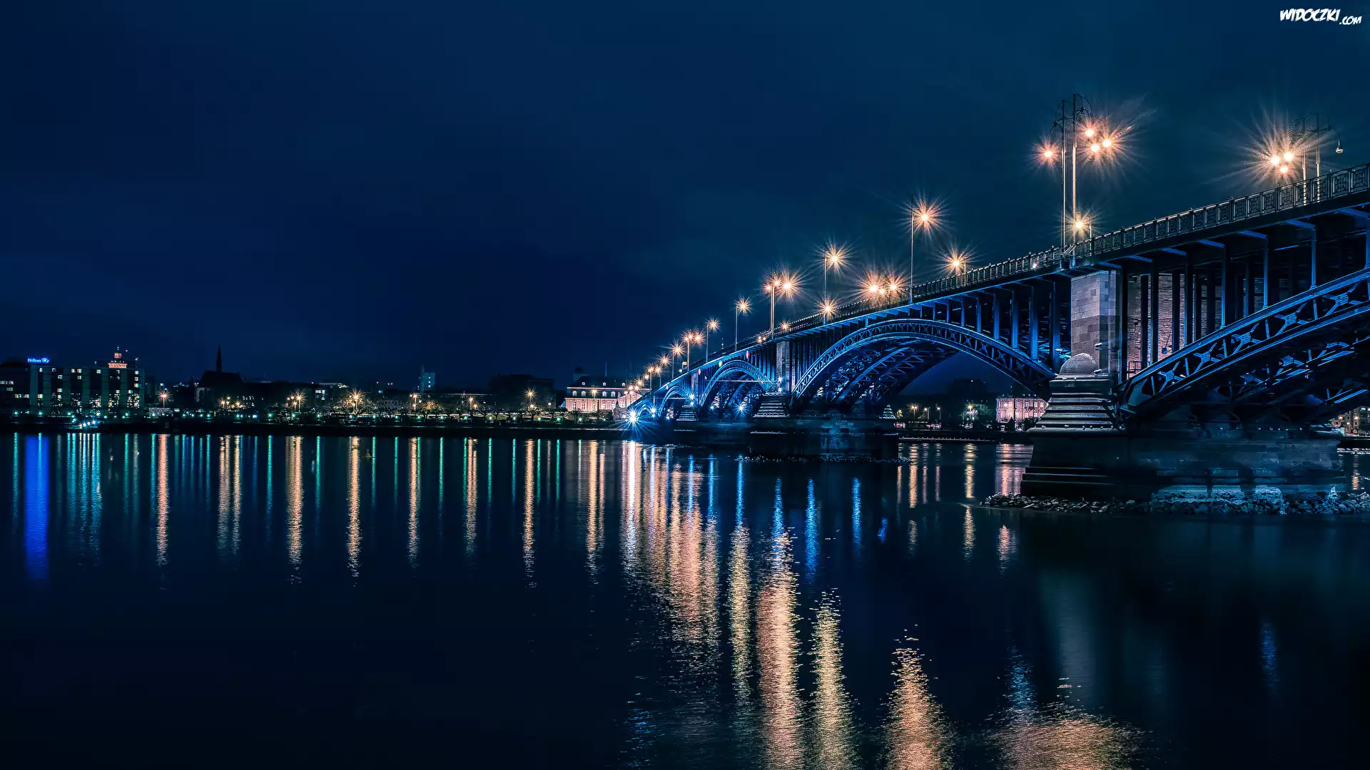 Niemcy, Miasto, Moguncja, Rzeka Ren, Most, Światło, Domy, Odbicie