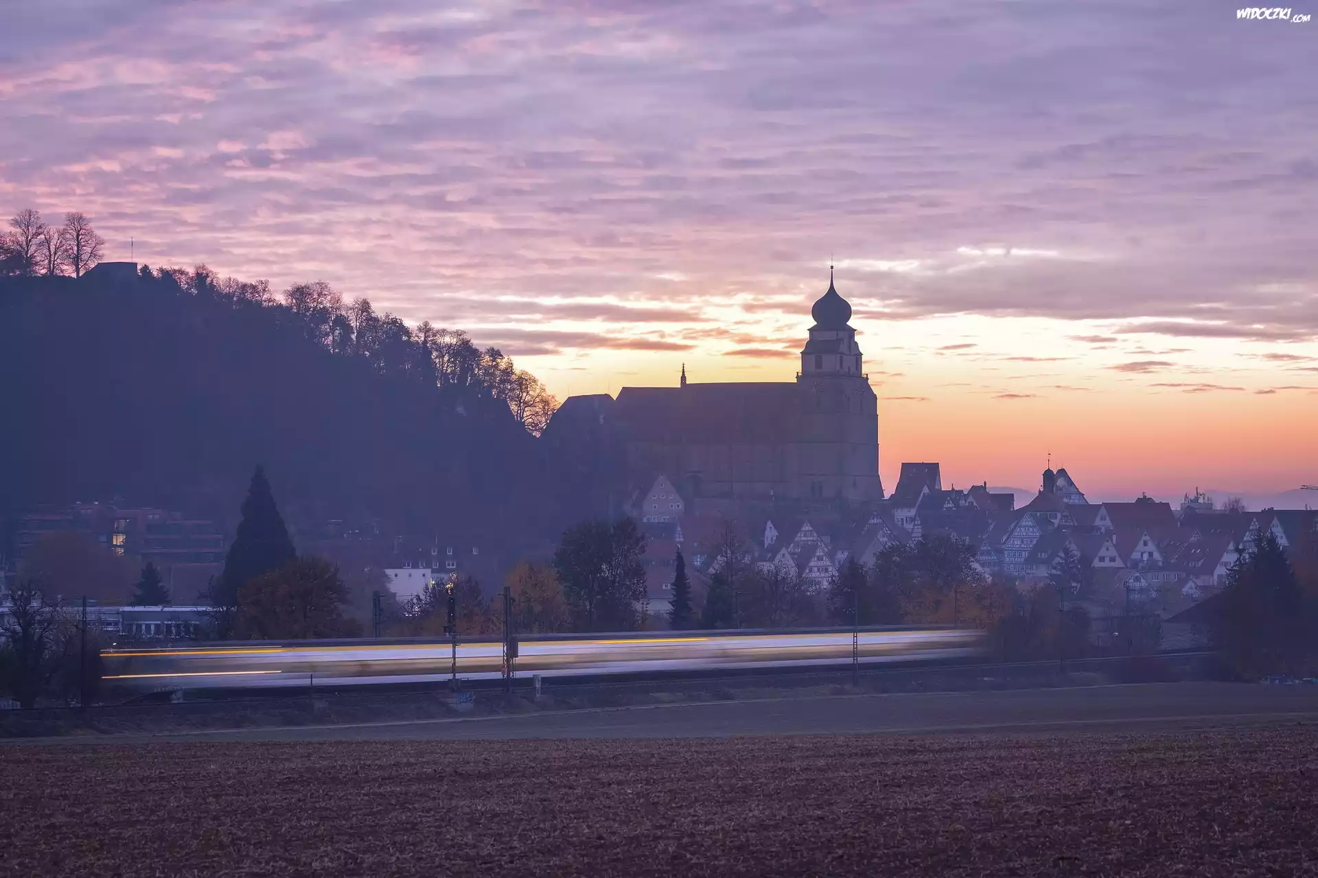 Zdjęcia, Kościół, Domy, Zachód słońca, Miasto Herrenberg, Badenia-Wirtembergia, Niemcy