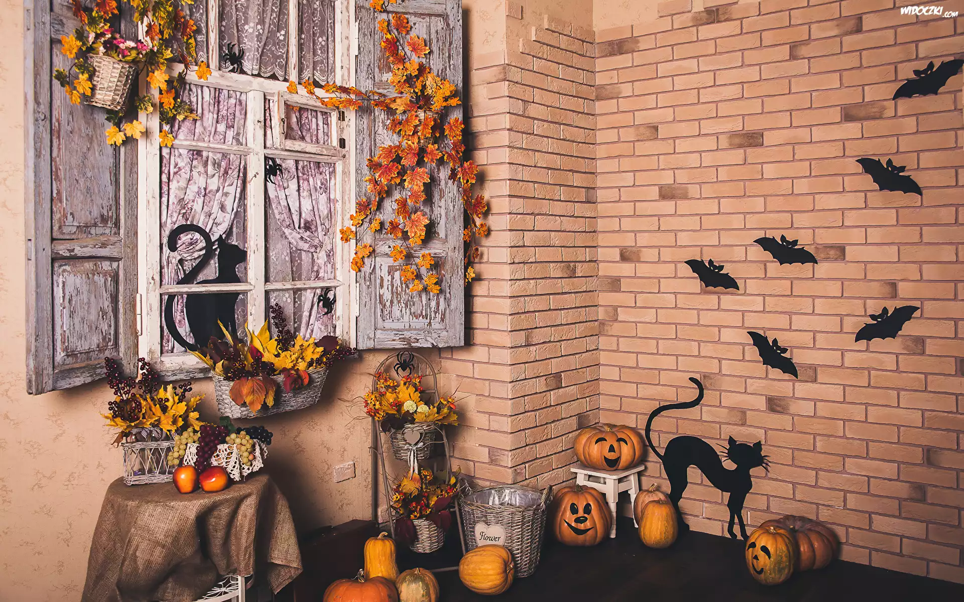 Halloween, Dom, Dynie, Koszyki, Ozdoby, Kwiaty, Koty czarne, Liście, Nietoperze