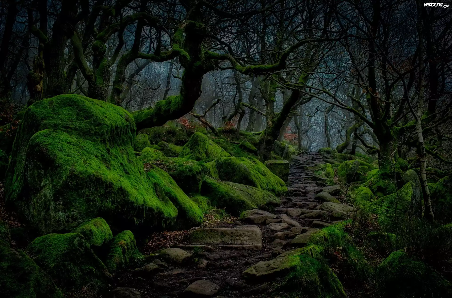 Zdjęcia, Anglia, Hrabstwo Derbyshire, Las, Drzewa, Omszałe, Kamienie, Ścieżka, Noc